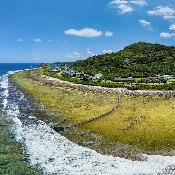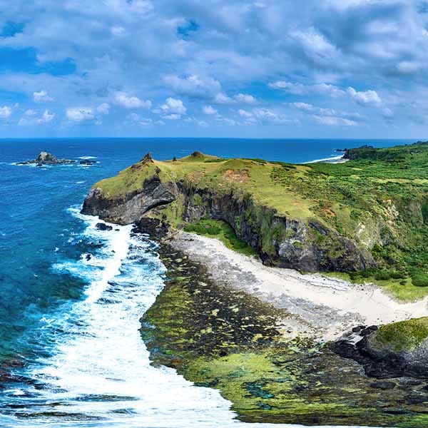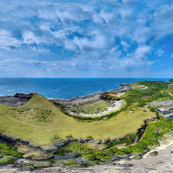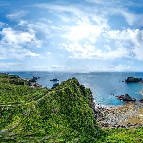 站在高度30公尺的台地上,俯瞰海岸線,茂密的綠草在平坦的海岬上蔓延,遠洋船隻與近海漁船來來往往,朝日溫泉的泉池與紫坪潟湖遙遙相望。